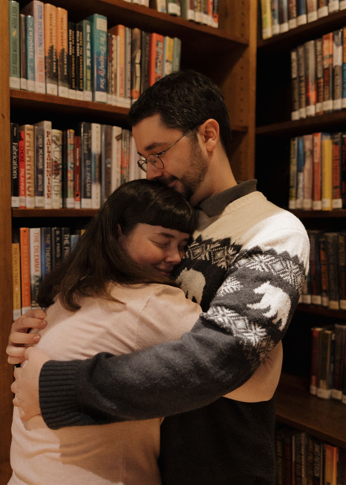 - hugging onto each other while scanning the books
